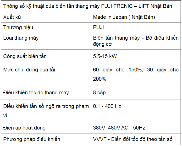 Thông số kỹ thuật của biến tần thang máy FUJI FRENIC – LIFT Nhật Bản