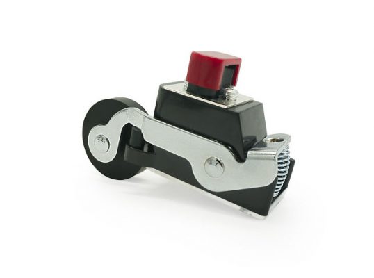 Công tắc hành trình thang máy giới hạn kiểu bánh xe có dạng thân nhựa có tác động một chiều. Dòng điện định mức lên tới 10A cùng khả năng làm việc với điện áp 500VAC. Tiếp điểm bao gồm NO, NC. Loại này chủ yếu sử dụng ốc siết cáp với nhiệt độ khi làm việc 70 độ C, tiêu chuẩn chống sốc điện cấp 2 và tích hợp bảo vệ ngắn mạch 10A