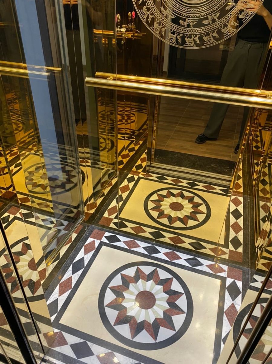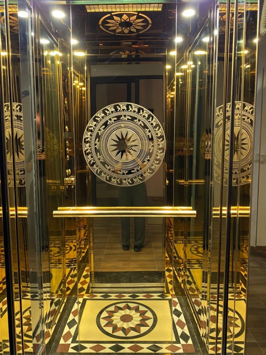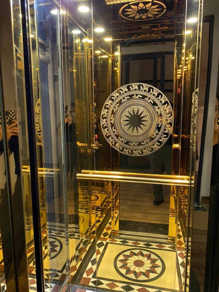 Cấu hình thang máy Inox gương vàng hoa văn. Lắp đặt trọn gói Bảo hành 24/7 Tư vấn, thiết kế miễn phí