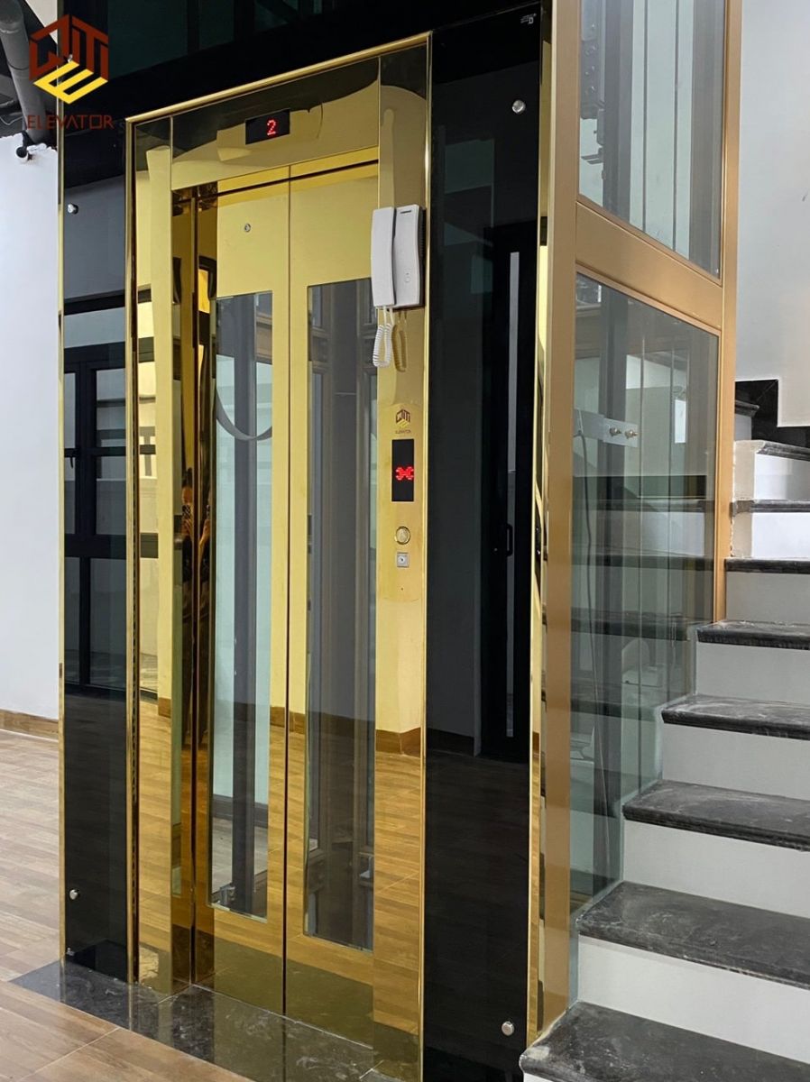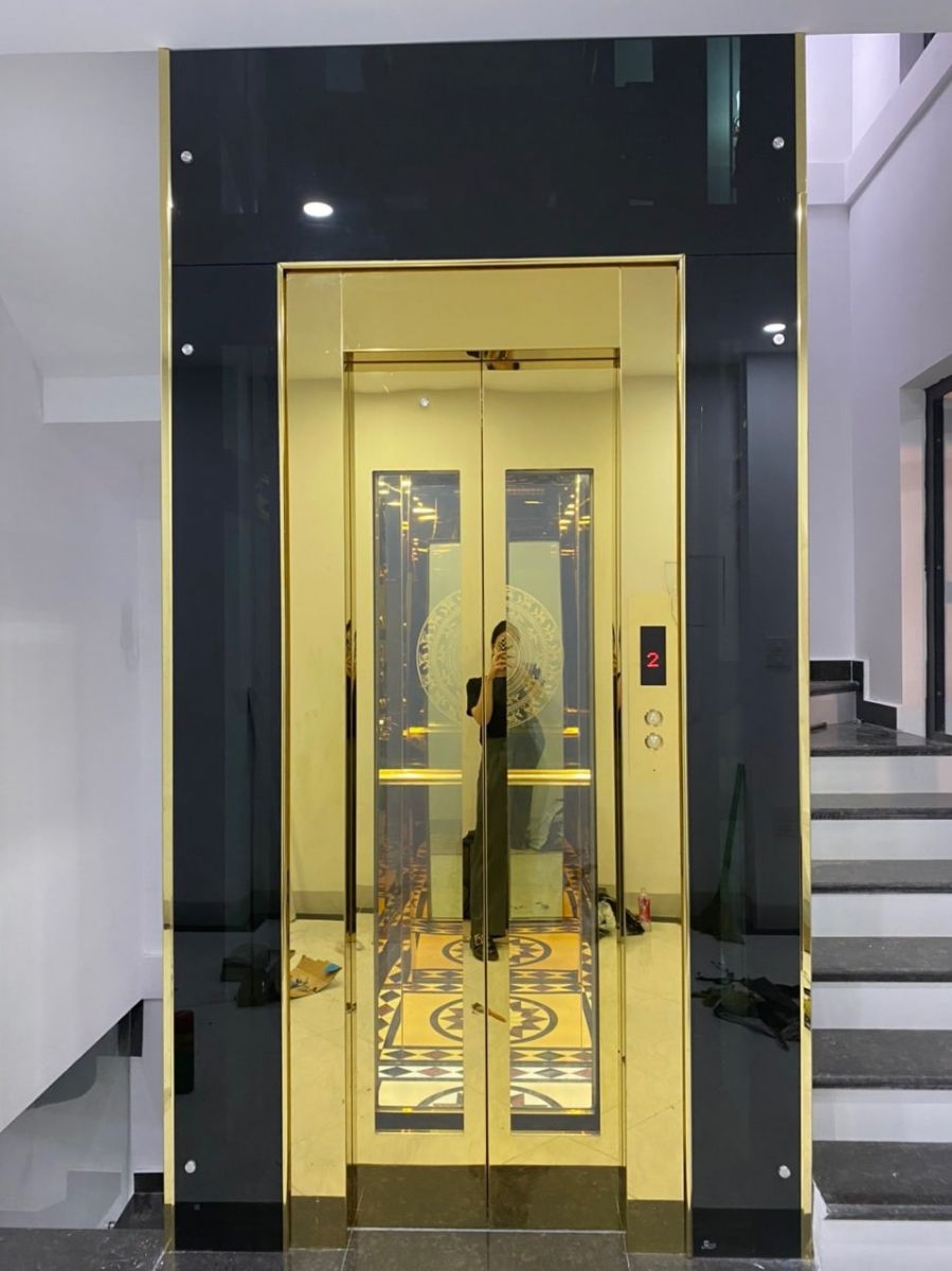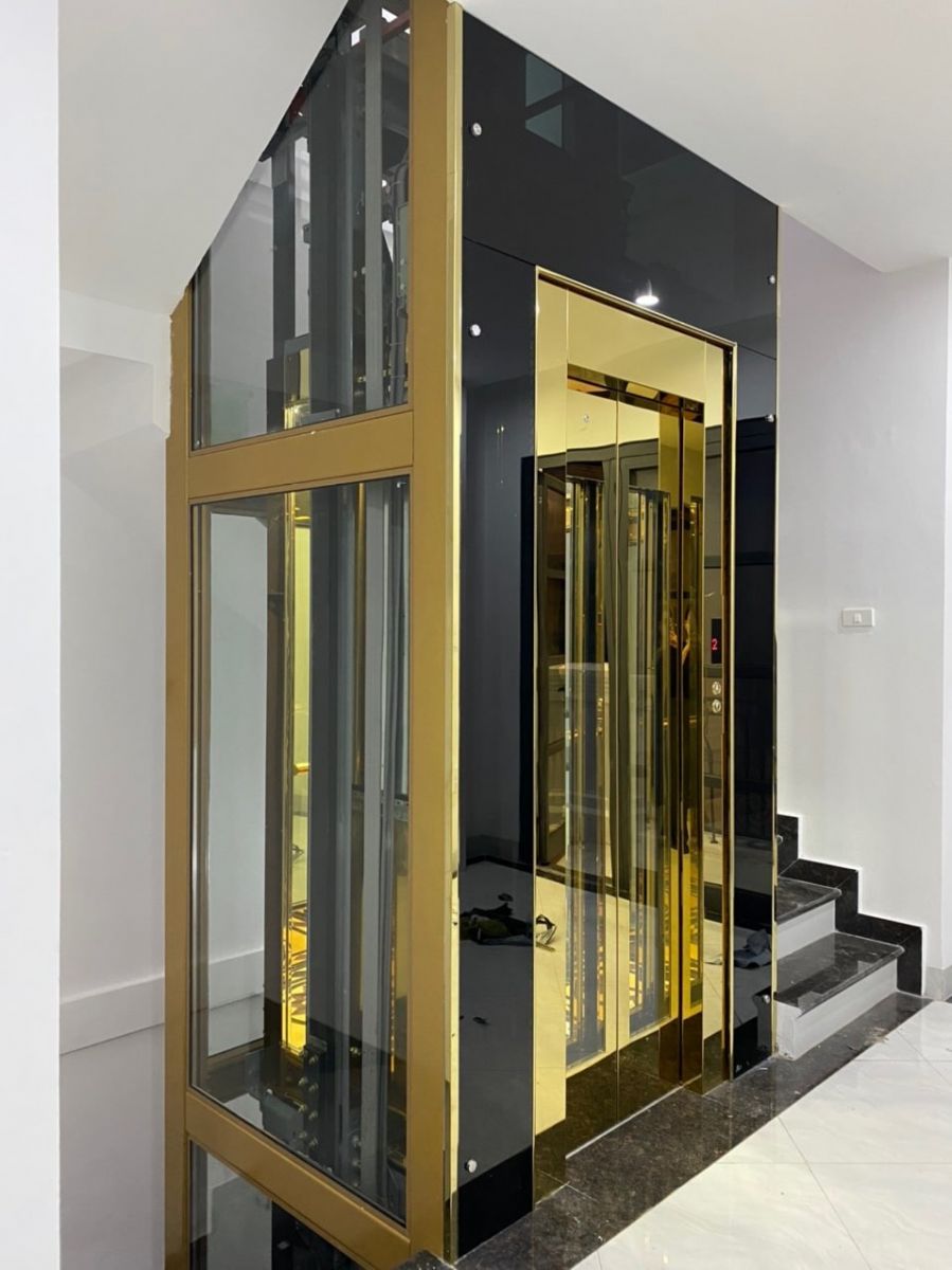 Thang máy cấu hình Inox gương vàng hoa văn, khung thép sơn tĩnh điện cùng màu thang, vách kính cường lực an toàn xanh đen ốp bao quanh khung thép