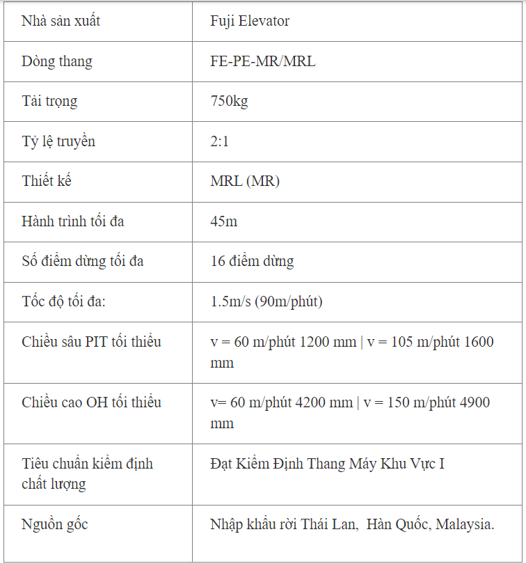Thông số kỹ thuật của Thang máy gia đình Fuji 750kg Tải Khách Liên Doanh