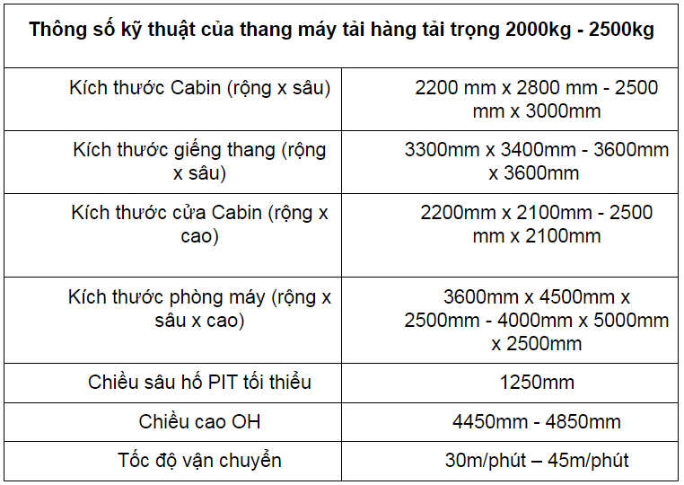 Thông số kỹ thuật của thang máy tải hàng tải trọng 2000kg - 2500kg