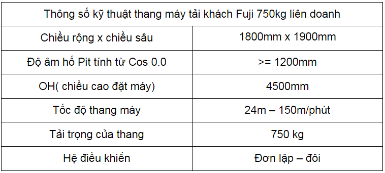 Thông số kỹ thuật thang máy tải khách Fuji 750kg liên doanh