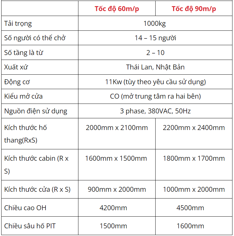 Thông số kỹ thuật của thang máy tải khách Mitsubishi tải trọng 1000kg